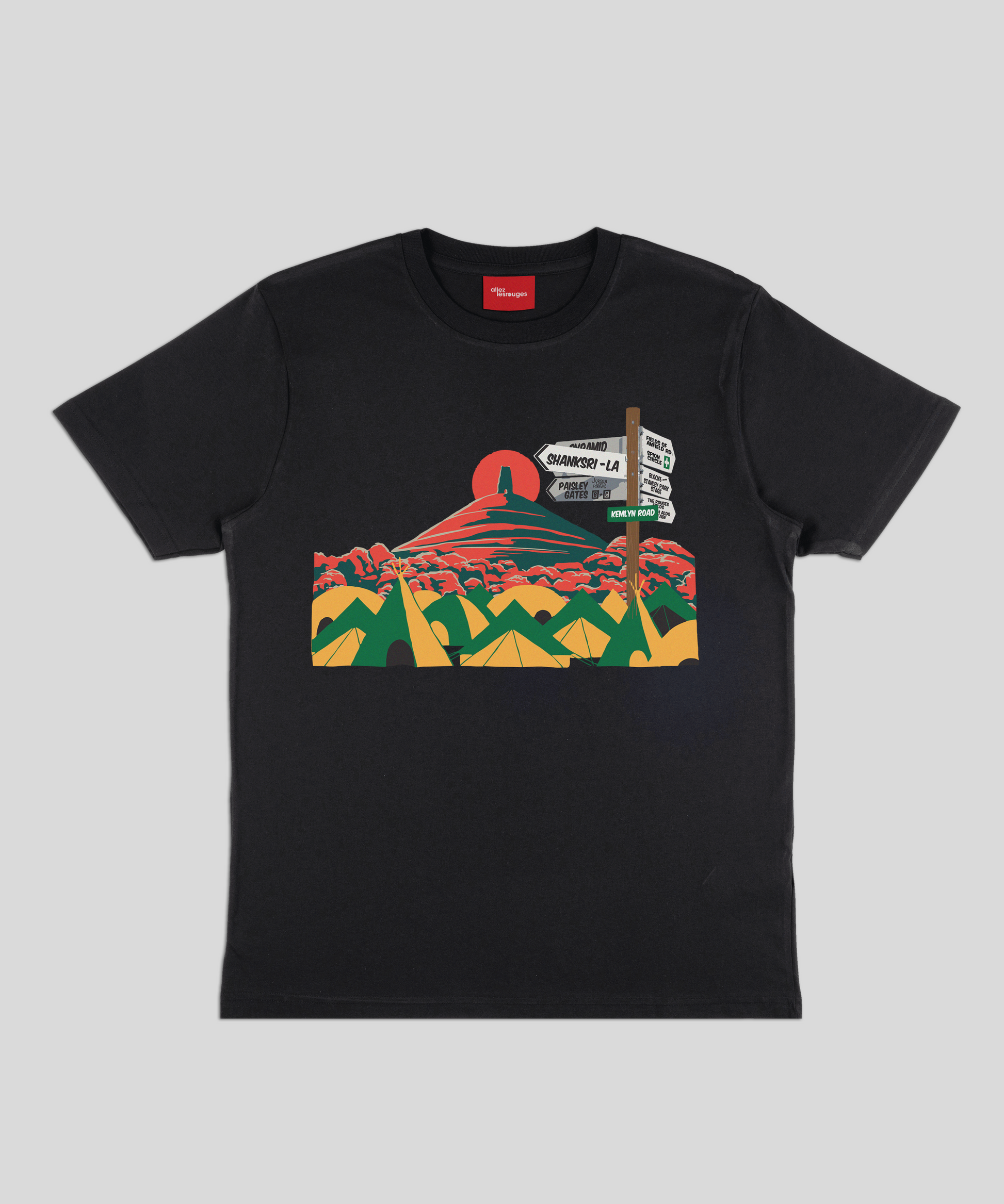 Our second Glastonbury t-shirt celebrating the greatest festival & football club in the world. This illustration features the Glastonbury Tor behind a collection of sign posts celebrating some of the most famous people and places that are synonymous with Liverpool Football Club.